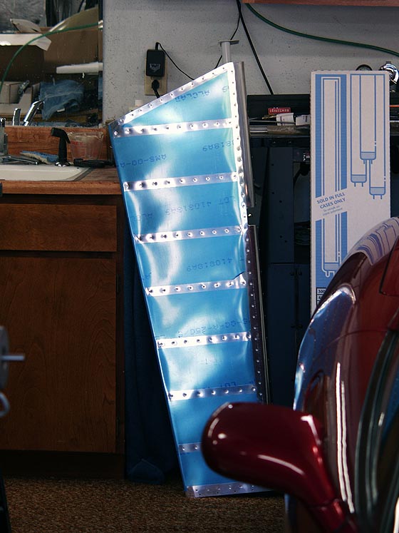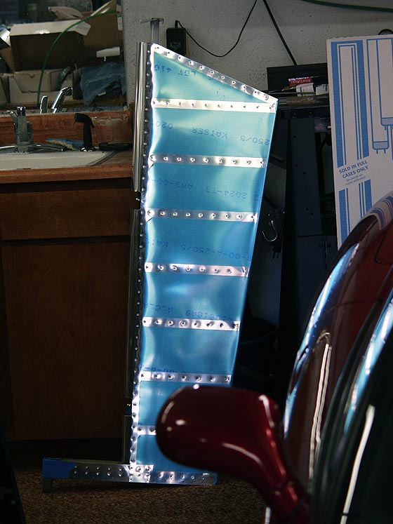 >Backing into the garage today I noticed the elevator skin bowing at the trailing edge in the review mirror because of the way the light was hitting it. Basically what the deal is I think is that I bent the trailing edge of the elevators more than necessary. So, when I pulled the leading edge apart to fit it over the spar, I now have a concave bowing effect between some of the bays. Van's goes to great lengths in the manual to make sure that bend the elevator trailing edges *enough*, but doesn't make mention of what is "too much". The radius of the trailing edge is still within spec and there is no cracking or stress marks. Its just bent too much and looks like of stupid.