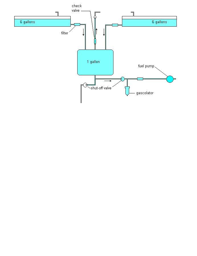 Tom, I agree. I have a shut off on each wing tank then they meet at a "T". Right after that is a facet fuel pump. I have a switch to turn that on and it quickly pumps the wing tank into the dash tank. ABout 2 litres or 5 US gal. The pump is to quicken the flow rate only , the pitot pressure will transfer the fuel from the wingtank to the dash tank at a rate higher that the burn rate.