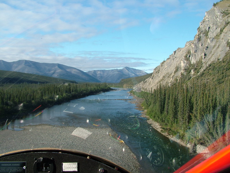Here is a photo I took flying south from Eagle Plains, YT, to Dawson City, YT. A beautiful morning for a little while. 30 minutes later and I was down on the road waiting for the ceiling to lift enough to fly again. |