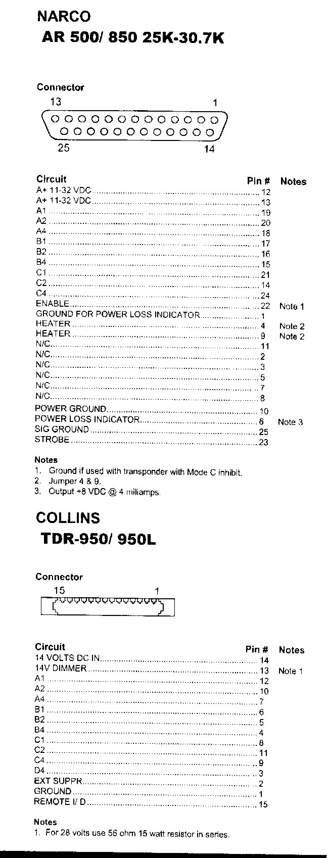 | Quote: | I am looking for pinouts for Collins TDR-950 transponder & Narco 500 altitu