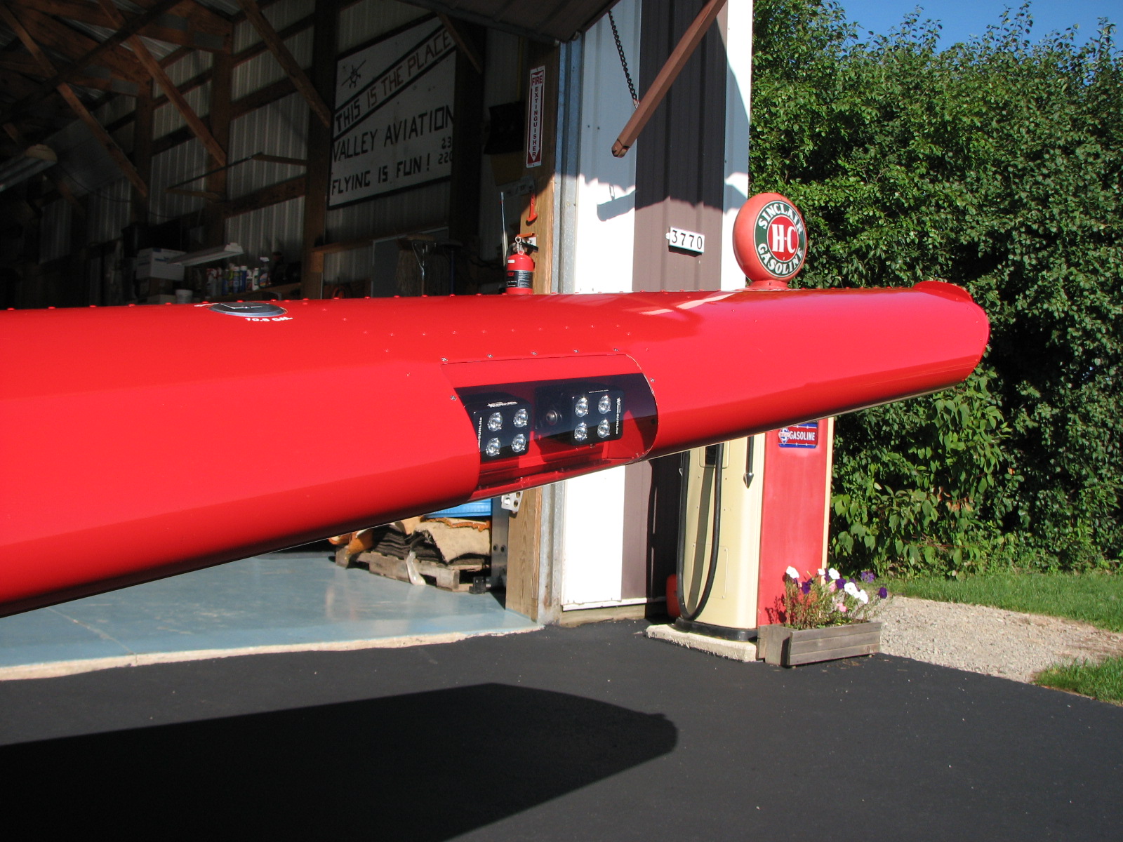 Like Rick said "This sounds like a commercial", but it's not. While at the show in Oshkosh I was looking at all the different light set-ups. I bought two LED lights (4 LED's per), one for landing and one for taxi. (SEE PICS Attached) I did not buy the one with 8 LED's because I have to set them at two different angles. Because of the hight nose angle of the HDS during landing I set one with a slight down angle and the other level to the ground for taxi. With the old set-up I would use one light at a time, but with the new LED's they are both on at once. The old lights would draw about 8 Amps. each and the new ones draw 9 tenths of an Amp. With both on at the same time they are brighter than one of the 4509's. The beam of light is much wider than the old ones so even the taxi light set level works as a landing light. I did not run any more wires to control the new lights. The switch I used for my taxi light is now used to control both lights in their Wig/Wag mode. The company I bought from is called AeroLEDs http://www.aeroleds.com/. "What a difference in current draw".