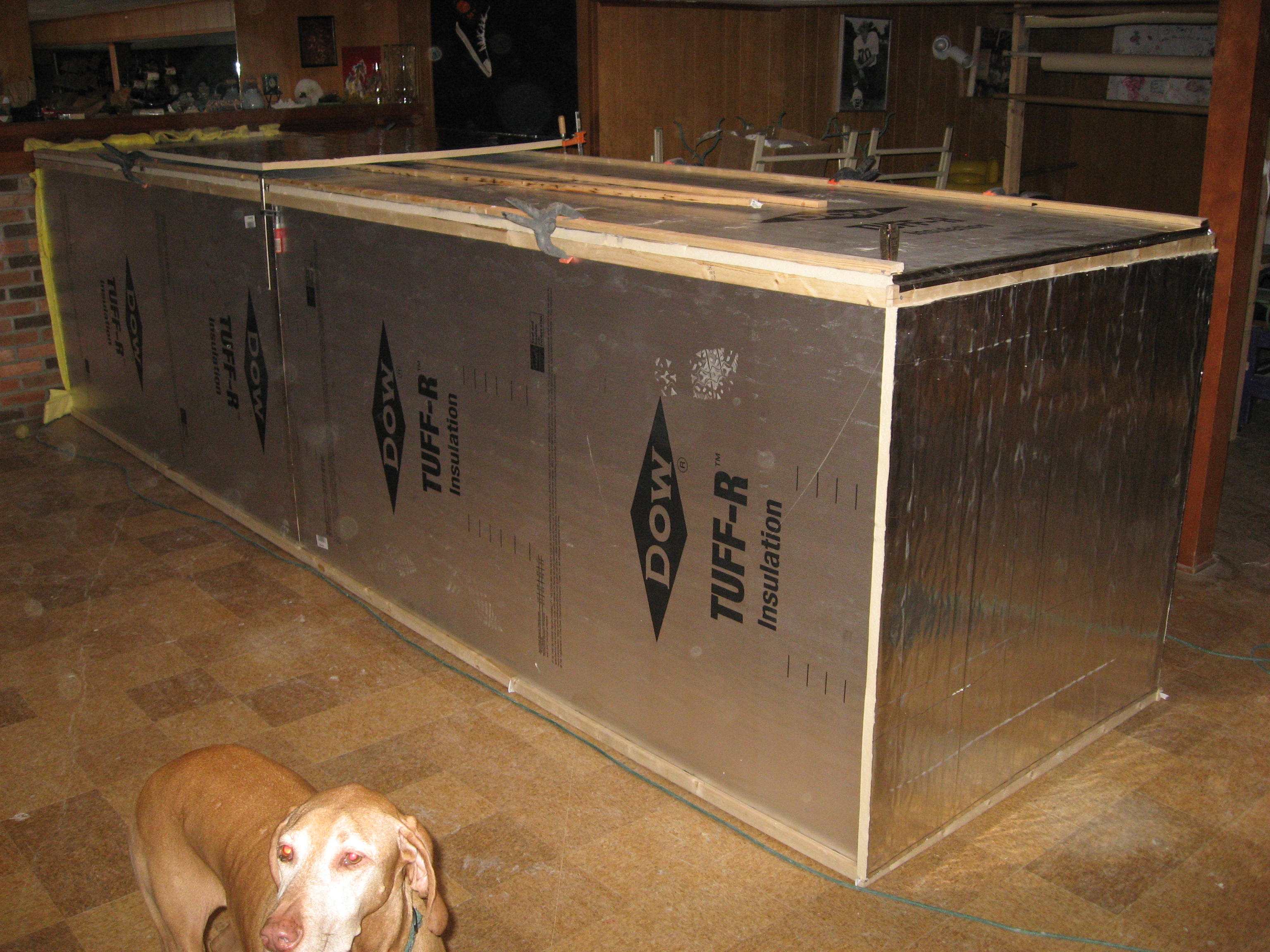 A question about post curing our epoxy parts. Today we built ourselves an "oven" for baking our parts at the appropriate 40-50 degree celsius for post cure. We built a 16' X 4' X 4' enclosure out of foil claded 4X8 sheets of insulation foam. The box is backed up to a basement brick fireplace (no open flames) in which I would like to place a suitable heating element. I also have use of an attic fan to low air around the cavity.