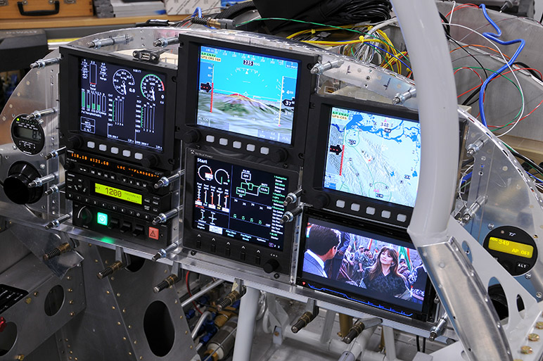 The panel on the RV-8 got the first power up today. I interconnected all of the major instrument panel devices to the Vertical Power VP-200 electrical system and powered everything up. In the center screen, you can see Mt Diablo in California. I was playing back a flight from a portable GPS I use in the rental plane. Notice the top of the mountain is RED which means that its above our current altitude (from the playback). The Kenwood is playing a James Bond movie...