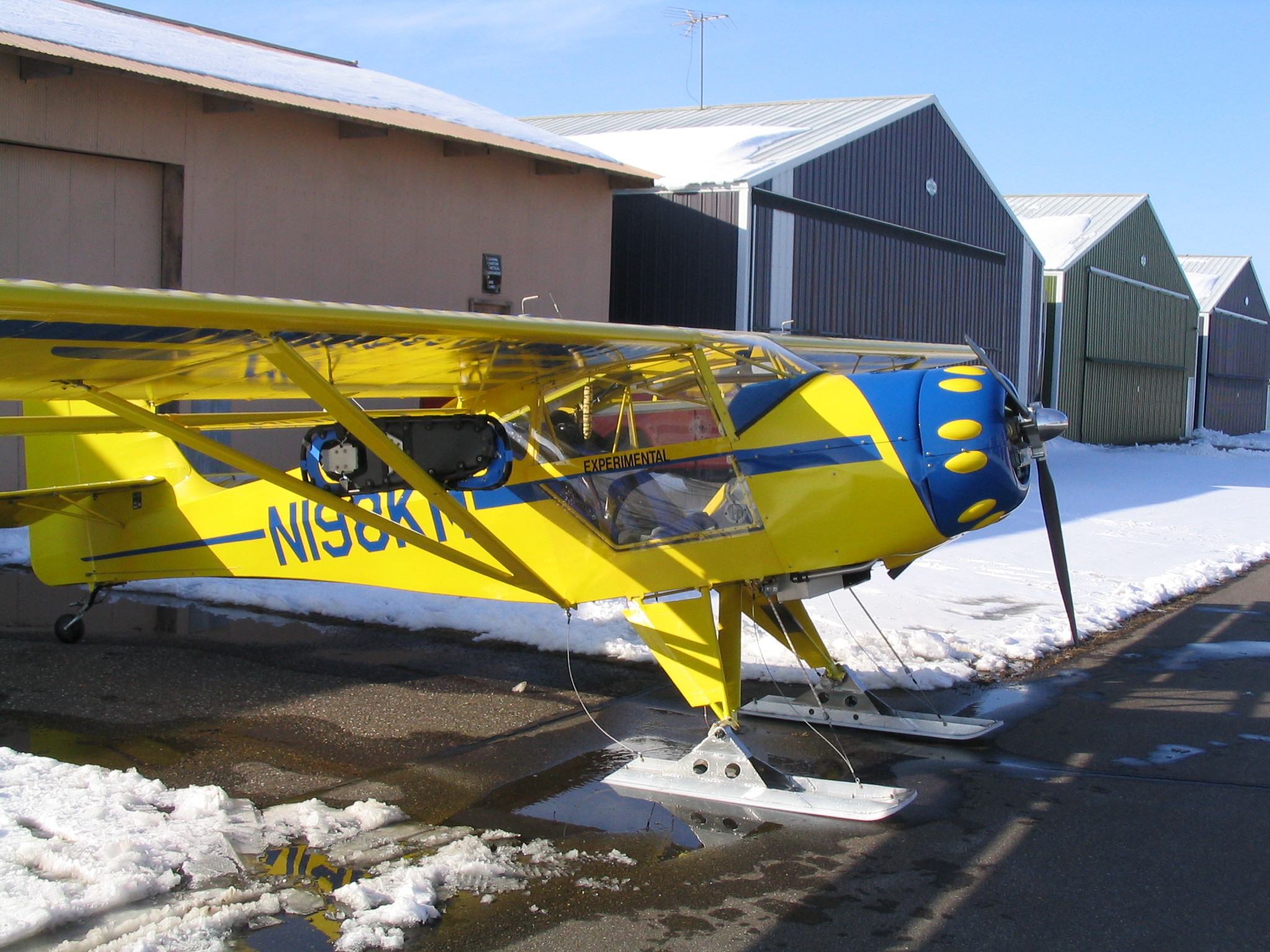 There are two wheels in tandem like a roller blade. I wanted only two wheels, otherwise one would not be able to turn the plane on pavement. Since these pictures I posted (taken in 2004), I purchased better wheels. The wheels I now have are 6" in diameter, and 2" wide. They are rounded so the profile is very small. As I stated earlier, the skis do very well in powder snow. I was at a grass strip with about 12" to 18" of tight powder snow, and the skis worked very well. I was off the ground in the same time as I would be on packed snow. When I shut down, I dug down into the snow to check how deep I sank and found that I went down about half the depth of snow (about 6" to 8" down). My prop was still well out of the snow. I made the skis a little tall because I wanted to keep the prop out of the snow as much as possible.