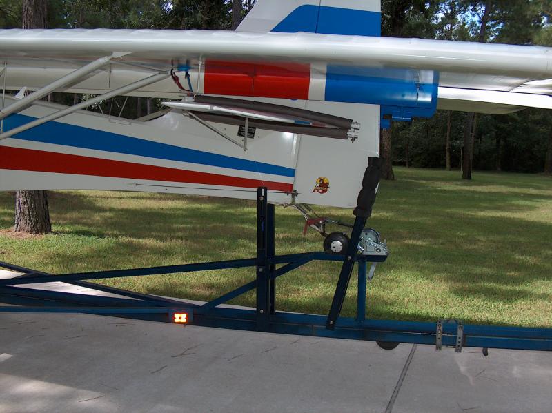 Finally, be sure to unload the tail spring. The tail is very heavy with the wings back, especially if you haven't de-fueled after flight (I always do). Install a brace to transfer the weight of the heavy tail to the trailer frame. This will spare the tw spring from the extreme wear it will otherwise experience during transport. I'm sure this factor has contributed to at least some of those broken tail springs that have been reported.