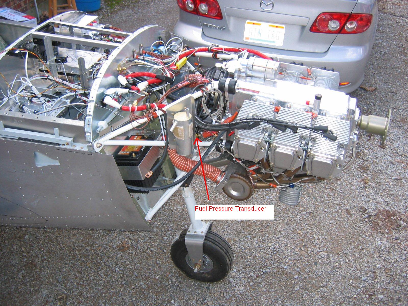 Unfortunately I do not have a good picture of my fuel pressure transducer. Attached is the best I have. I mounted my oil recovery bottle on the right side motor mounts by way of sheet aluminum and adel clamps. I mounted the fuel pressure transducer to the back of this mounting sheet using a big adel clamp around the transducer.