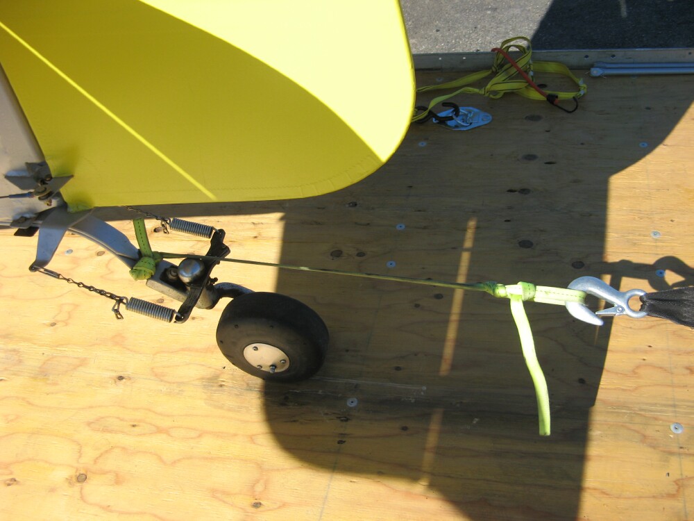 It is an old two place snowmobile trailer. I replaced the tongue with one 16 feet long. There is a little hand crank boat winch on the front of the tongue to crank the Kitfox up onto the deck. I set the tail on the deck before folding the wings.