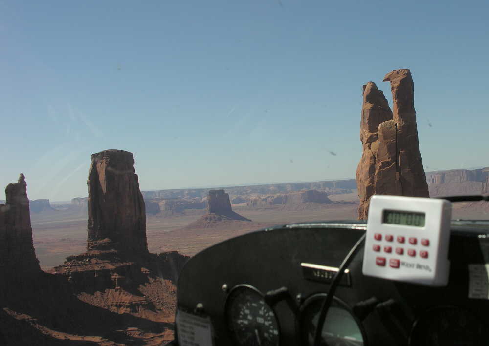 On the ride with Dave in his C-175, we went between 2 of the spires, or "monuments" on the way back from Mexican Hat. This looks pretty impressive - and it was - but don't get too excited about risk. We were at least 500 ft agl, (these things are ~700 ft high) and the spires were more than 100 yards from each wingtip. The telephoto lens makes 'em look very close, but it was plenty exciting as it was.