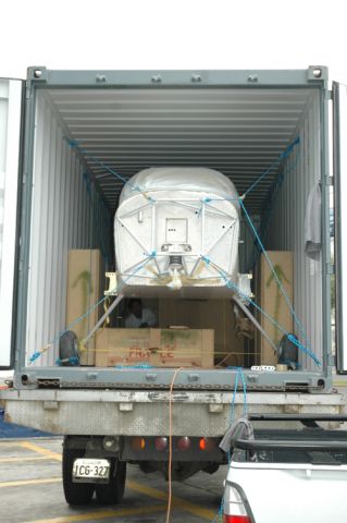 Since we’re on this subject, here’s a couple of pictures of our “truck” packing. Everything was in crates except the fuselage and HS, then very well secured several ways. The width of the gear was a press-fit into the container, but it did fit. We just lifted it up and in, but ramps would be nice also if you can keep them from sliding or falling off.