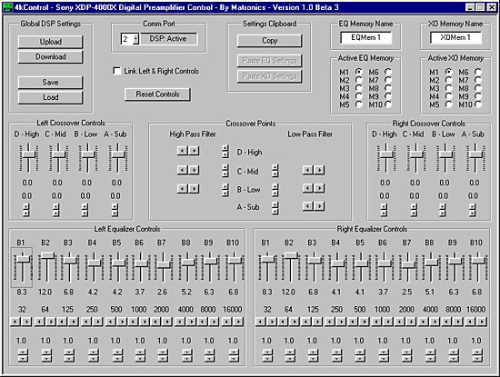 4kControl by Matronics allows the owner of Sony's XDP-4000X digital preamplifier to precisely control all of the unit's adjustable parameters. Controls are laid out in an intuitive manner and adjustments are made in a manner similar to a conventional Analog Equalizer. 4kControl allows the user to download and upload all settings in the XDP-4000X's 10 memory locations as well as save and load the settings to disk file. Adjustments to the DSP's 20 bands can be made individually and include the Level, Center Frequency, and Q Value (width of band). The "Link L & R" check box can be used to lock the Right Channel controls to that of the Left Channel during the adjustment.
